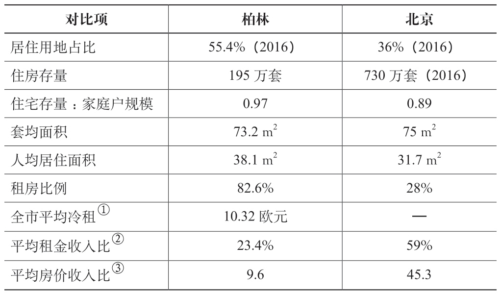对比项柏林北京居住用地占比55.4%(2016)36%(2016)住房存量195 万套730 万套(2016)住宅存量:家庭户规模0.97 0.89套均面积73.2 m2 75 m2人均居住面积38.1 m2 31.7 m2租房比例82.6%28%全市平均冷租①10.32 欧元—平均租金收入比②23.4%59%平均房价收入比③9.6 45.3