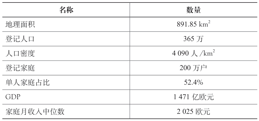 名称数量地理面积891.85 km2登记人口365 万人口密度4 090 人/km2登记家庭200 万户单人家庭占比52.4%GDP 1 471 亿欧元家庭月收入中位数2 025 欧元