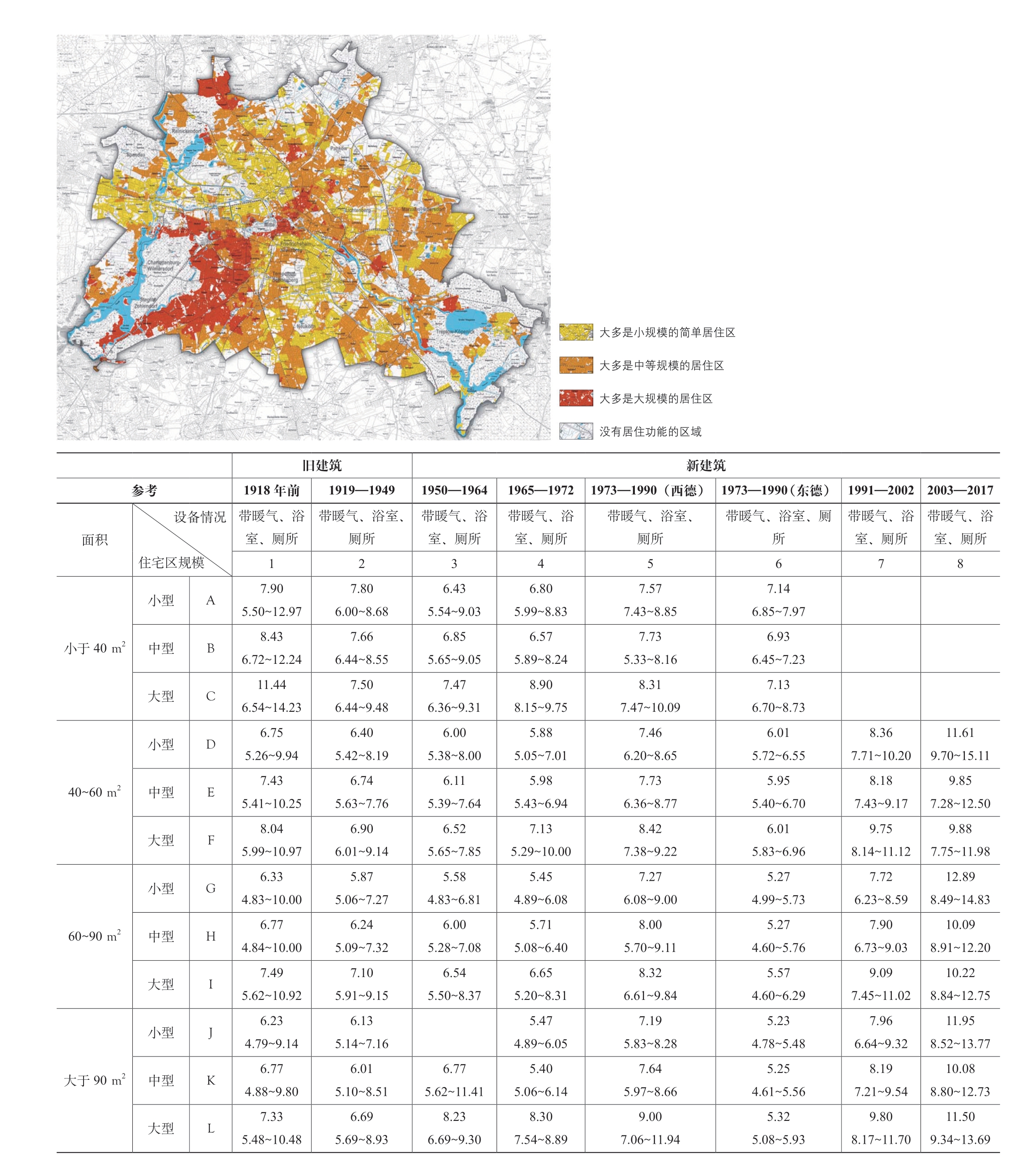 注:上图为2019 年柏林市住宅分布图,下图为针对不同状况住房的每平方米租金建议。下图中显示的是不同类型住宅的冷租租金(单位:欧元/日·平方米),其中表格下方数字为对应类型冷租租金的价格区间,当该类型租金价格数值超过10 个时,对其进行顺序排列,取这一组数值中间的3/4 部分作为租金价格区间的上下范围,表格上方数字为下方数字的中位数。