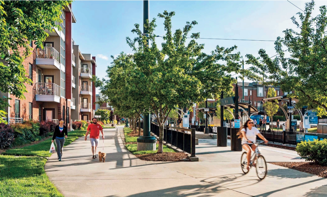 公交导向的紧凑型城市形态与多尺度开放空间整合是精明增长理念的重要特征[20-21]。夏洛特人口的快速增长激发了替代性交通工具的发展,蓝线轻轨十多年来的运行除证明了市民对优质公交服务的强烈需求,更是在2007—2012年的经济低谷期激发了南端区的11.5 亿美元投资,形成了新的发展廊道[22]。2018 年开通的蓝线二期延伸了18 km,新增14 个站点,连接市中心和大学城,为拥挤的I-85/US29 高速路走廊提供了另一个通勤服务选择,并引导了就业、娱乐、文化、零售物流的沿线聚集。而区别于以往轻轨站点和沿线附近以交通为导向的空间,夏洛特在蓝线站点和沿线打造了连续的轻轨步道体系(图4),成为多尺度和多用途的新型城市开放空间体系,既能将消极的交通性空间转换为积极而有活力的城市公共空间,也能将开放空间与社区的发展紧密结合起来。同时,轻轨步道新型开放空间作为公共设施能够鼓励沿线开发,提升地产价值[23],引导城市更紧凑、高效、精明增长[24],取得了优化城市空间结构与布局的良好效应。