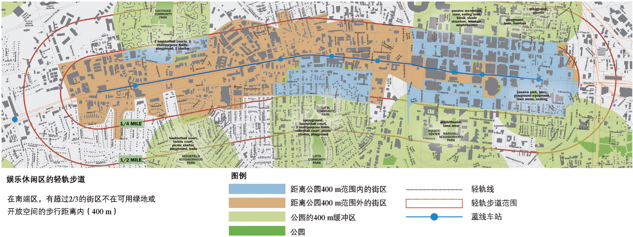 图7 南端区中的娱乐休闲区轻轨廊道及其周边辐射区域