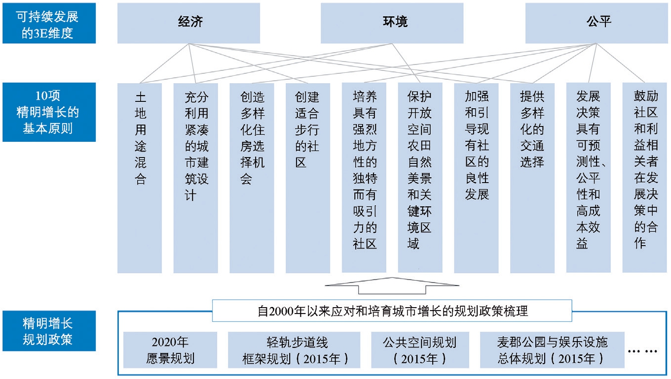 精明增长建构在可持续发展的三个维度之上,即经济(Economy)、环境(Environment)、公平(Equity)的3E 维度,是一种基于可持续性理念的概念。精明增长和可持续发展都表明了对环境退化和资源枯竭的关注,都呼吁落实明智的发展策略,许多可持续发展目标都体现在精明增长原则中[10]。美国环境保护局更是将精明增长定义为“为经济、社区和环境服务的发展策略”[11],将精明增长与可持续发展的3E 维度紧密结合起来。