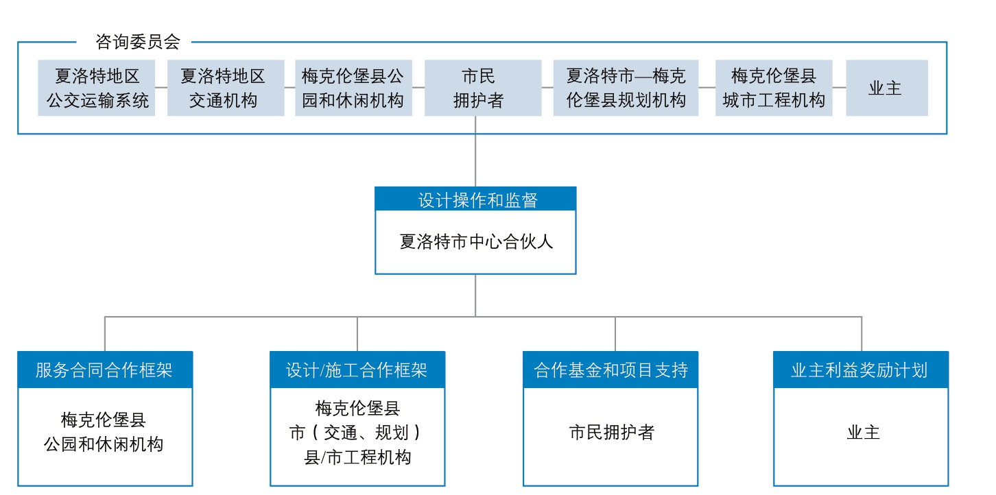 美国规划体系在长期发展历程中逐渐形成了规划管控与空间发展分离的策略,避免了政府的一手包办,也对精明增长理念在政策实施过程中所遇到的与原有法规的冲突和居民的不信任等问题作出了应对[12]。基于这个理念,美国大城市纷纷成立第三方机构,如亚特兰大的市中心发展组织(CAP:Central Atlanta Progress Inc)、费 城的市中心发展团体(CPDC: Central Philadelphia Development Corporation)等,在城市更新中扮演了重要角色,成为美国多元化城市管理体系的特点之一。这样的机构是代表城市中心土地所有者和商业实体利益的非政府、非营利机构,独立于政府体系中的规划、审批、执行等部门。夏洛特的“市中心合伙人”就是这样一个机构,管理着市中心上城区和南端区的发展、招商与协同。