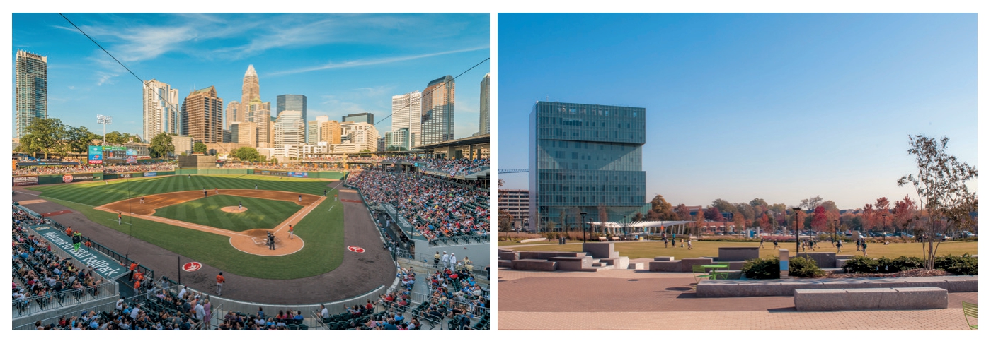 依照这些规划,“市中心合伙人”协调市政府、梅克伦堡县(Mecklenburg County)其他公立机构、开发商和私营机构共同推动一系列开放空间的建设,促进了全县公园体系的链接。2013 年建成的棒球场公园、2016 年建成的第一区公园(First Ward Park)(图3)都起到很好的触媒作用,备受市民欢迎的开放空间替代了市中心大片消极的地面停车场,并带动了周边地块开发。连接上城区和南端区的“轻轨步道”开放空间在更大范围产生了明显的经济和社会效应。