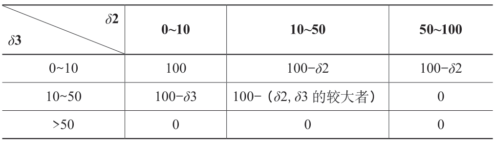 其中,δ1 +δ2 =1。综合分析δ1、δ2、δ3 的数值,对境外产业园区用地规划实施情况进行打分,为简化得分算法,研究选取δ2、δ3 进行组合赋分,具体赋分如表7 所示。