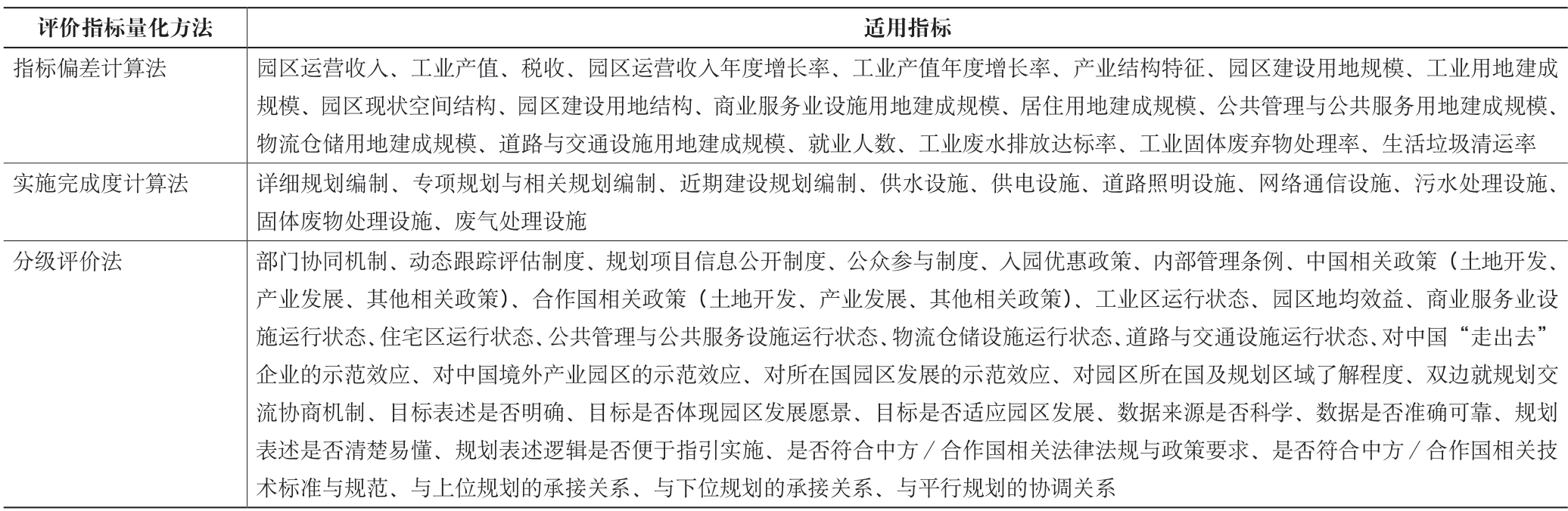 依据指标属性的不同,境外产业园区总体规划实施评估指标可分别采用指标偏差计算法、实施完成度计算法与分级评价法进行量化赋分。其中实施完成度计算法、分级评价法中的具体赋分,参照国内城市总体规划实施评估相关研究的划分方法和常规分级评价标准,并结合境外产业园区发展特点综合确定。各类量化方法所适用的指标如表5 所示。