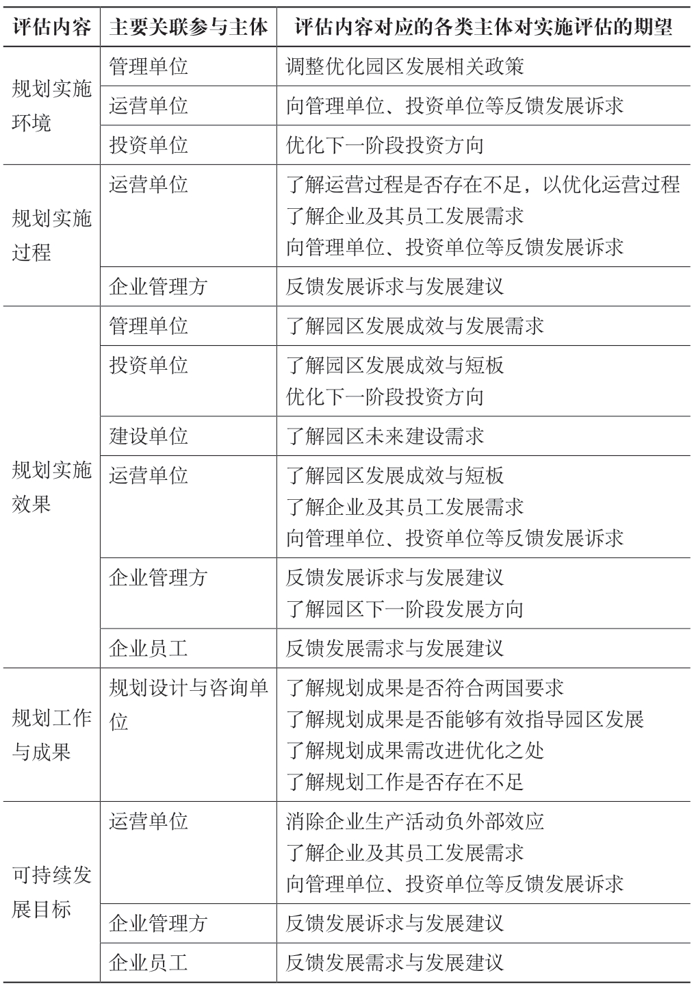 表3 各类参与主体评估期望与境外产业园区规划实施评估内容关联分析