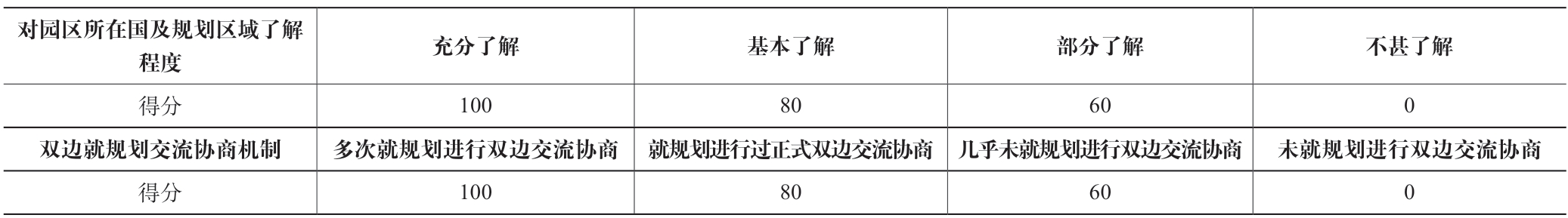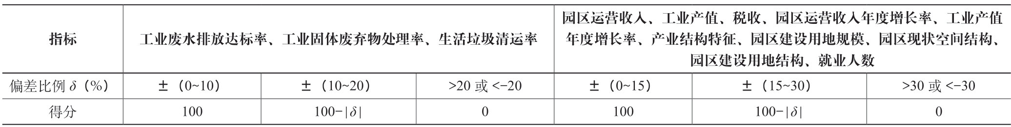 笔者在境外园区实地调研过程中了解到,园区运营收入、工业产值、税收、园区运营收入年度增长率、工业产值年度增长率等发展类指标受招商引资和产业发展的不确定性影响,往往难以如期实现规划目标;工业废水排放达标率、工业固体废弃物处理率等环保类指标取决于园区开发商在环保方面投入的成本和设定的标准,受外部环境影响较小。此外,园区所在国对于园区内的开发建设活动管理相对宽松,对于环境保护等要求则较为严格。因此在定量分析规划目标实施偏差程度时,与园区可持续发展直接相关的目标其较高得分对应的偏差比例范围相对较小,与园区可持续发展非直接相关的目标其较高得分对应的偏差比例范围相对较大,偏差比例和得分设定如表6 所示。