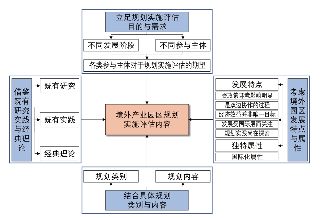 有别于非国际合作型园区,境外产业园区具有国际化属性,其发展不仅是双边协作的过程,也受到国际层面的关注。另外,境外产业园区的发展受中国与所在国政策环境影响明显,但经济效益并非其唯一目标,其规划实践仍处于探索阶段。这些特点与属性使其规划实施评估应从多方面考虑。