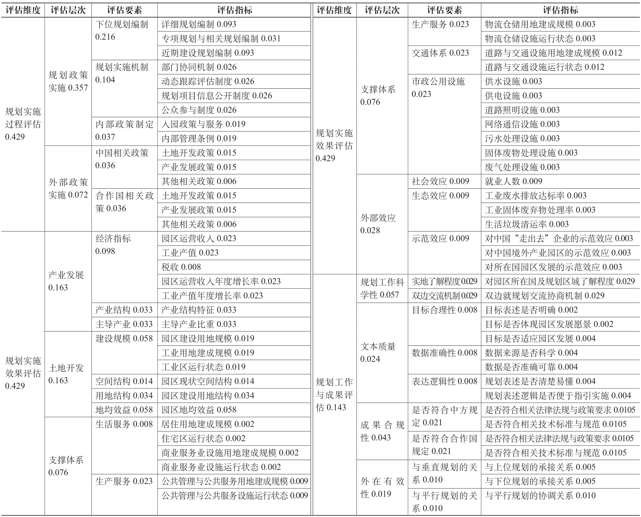 表4 境外产业园区总体规划实施评估指标及其权重分配