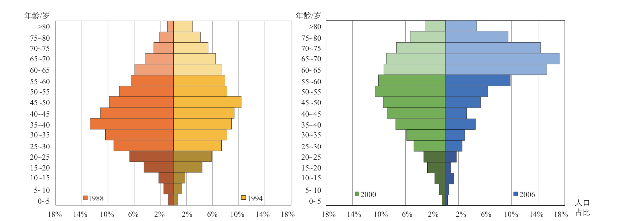 图3 1988-2006 年丸龟町商店街人口年龄结构变化