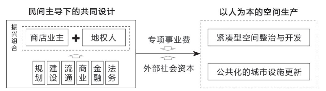 首先是街区发展与治理结构的转型。丸龟町商店街所开创的民间主导型振兴开发模式揭示由民间主导治理既可以规避行政失效风险,也可以提升社会成员的公众参与,妥善处理不同社会成员的利益关联,实现公众参与、商业开发、社区营造的“帕累托最优”①“帕累托最优”:由意大利经济学家维弗雷多·帕累托提出,是指一种能达到经济效率最佳的资源分配的理想状态。。虽然我国城市土地为国家所有制,商业街区土地再开发不存在面向居民的地权征收矛盾,仅需完成居民与业主的个人财产权赔付。但是作为直接利益相关者,居民、业主等社会成员理应享有商业街区振兴营造的知情权和参与权。