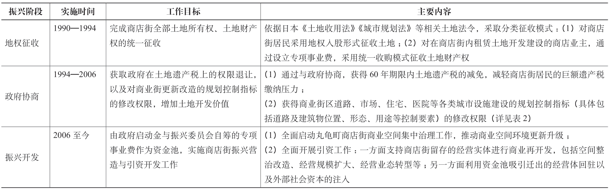 表1 丸龟町商店街振兴营造的不同阶段及其工作内容