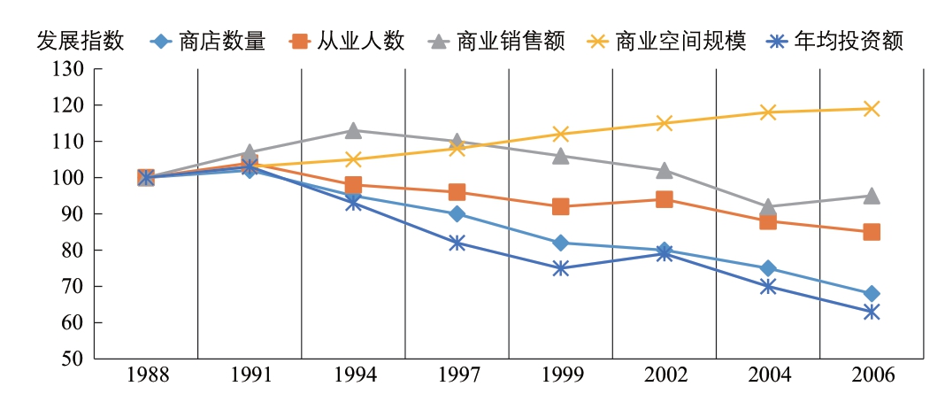 一方面,郊区化投资热潮催动城市核心商业资本向郊区的商业、住宅等不动产开发转移投放,导致商店街原有的社会资本投递渠道被挤压,面临经营主体转移、撤资、退出的市场风险;另一方面,社会整体消费从商品供给主导向顾客需求主导转移,传统小型零售“业种店”①业种店:日文为“業種店”,指商店街内居民商户自主经营、规模偏小、品种多样的小型零售商店,区别于外部资本运作、以满足多元化市场需求为主导的大型百货、专卖类业态店。无法满足顾客的多元需求,导致商店街总体经济萧条[11]。1988—2006 年间,商店街总体销售额下降36.9%,对商店街的年均投资额减少近40%,整体商业营收趋于负增长。