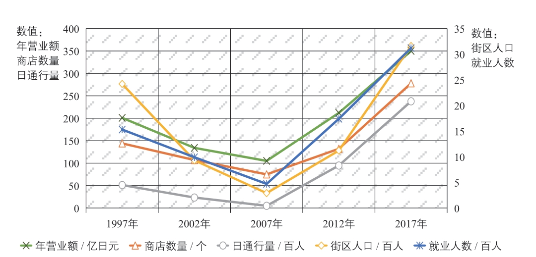 城市经济学理论认为:伴随着城市资本和劳动力等可流动生产要素向外部转移,城市物理空间往往会出现同步衰退现象,包括工业生产空间和商业服务空间等的衰退[10]。对于丸龟町商店街,其衰退特征显著表现在经济、人口与空间三个维度。