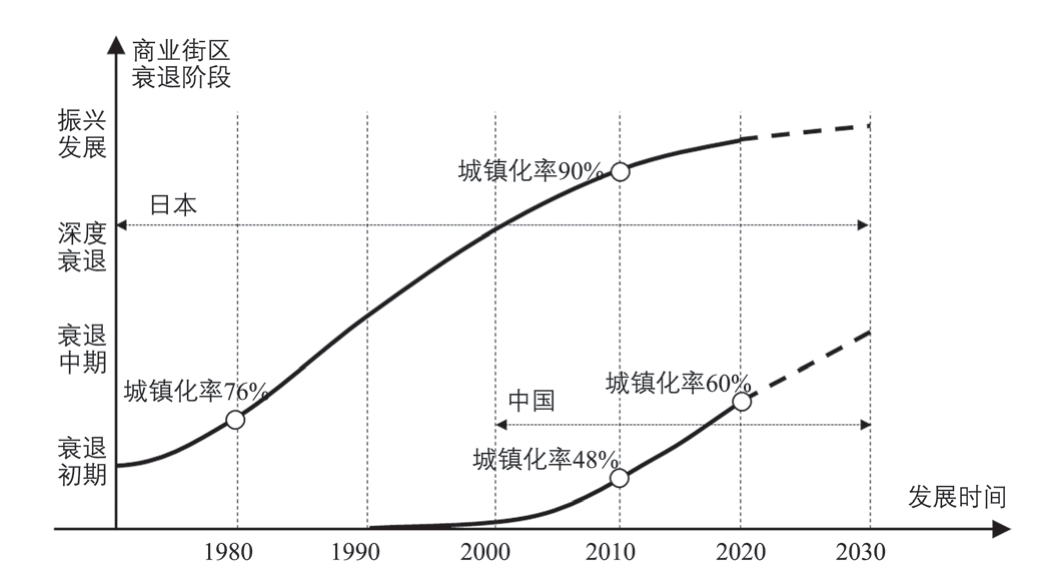 对比中日两国中小城市商业街区更新的相关实践,发现尽管两国在土地制度、城镇化水平以及衰退机制等特征上具有一定差异,但现阶段我国中小城市商业街区在商业空间形态、商业发展模式、商业经营主体等特征上同1990 年以前的日本中小城市商业街区高度相似,并表现出类同的商业街区衰退现象(表6)。对于现阶段我国中小城市来说,商业街区的衰退现象仍处于初期阶段,其衰退程度较低,相关社会经济问题尚未凸显,与日本深度衰退阶段之间表现出约40年的发展“时差”(图10)。正是这种“时差”的存在,为我国中小城市商业街区借鉴日本商业街区振兴营造的成功经验提供了可行路径。尤其是丸龟町商店街,其所实施的民间主导、共同设计、资本投放等更新制度,及其所达成的紧凑型、公共化、人性化空间形态,对于应对当前我国中小城市商业街区更新困境具有较高的现实借鉴价值。