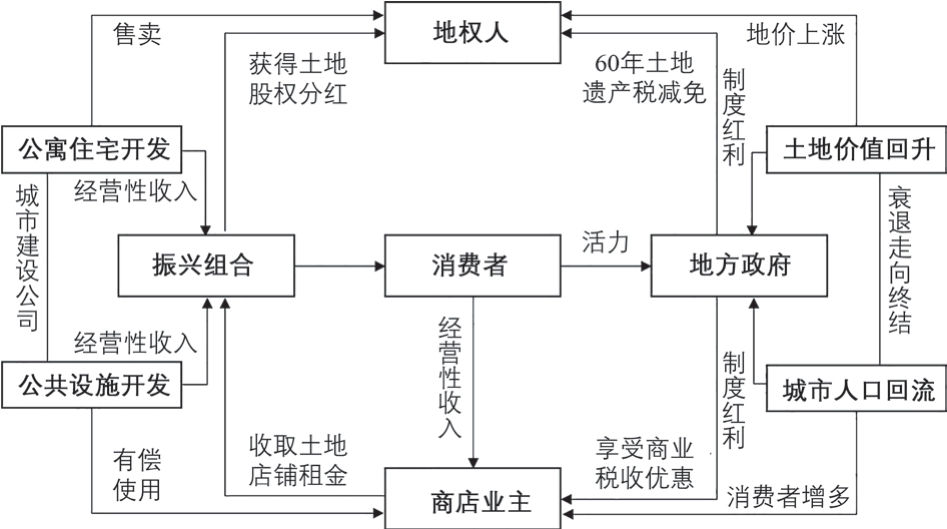 作为经营性商业空间,实现个人、集体与公共利益分配最优与价值最大化是商业运营的基本行为准则,也是丸龟町商店街振兴项目所设定的预期目标。在活化振兴过程中,商店街通过实施日本土地法令《借地借家法》于1992 年修正后所提出的“定期借地权”①定期借地权:日本借地权制度的一种,指在一定期限内向地权所有者租赁土地经营权的地权转让行为。,创新地提出新的土地运营方案:在地权征收基础上,与街区居民(土地所有者)签订为期60 年的定期借地权契约,并委托城市建设公司统一经营管理,从而实现土地所有权与使用权分离,提升土地价值;在经营过程中,城市建设公司在保证土地经营合法化基础上,以地费形式将土地经营盈利分配给地权人,以实现地权人入股成本最低和土地价值回归。在地权分离模式下,商店街大量削减了高额的土地征收费用,同时大幅降低了振兴成本,最终实现振兴委员会、地权人(居民)、商店业主、地方政府等全部参与成员达成了利益共赢的最优形态(图8)。