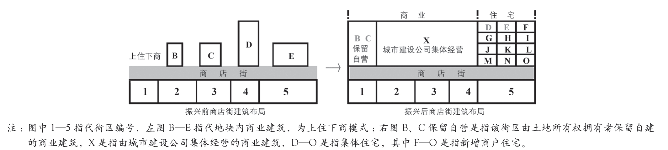 近年来,为应对城市人地矛盾、环境恶化、交通拥堵等问题[24],以“土地集约利用”“空间高效使用”为导向的“紧凑城市规划”理念逐渐成为我国城市发展的主导方向。尤其是对于衰退型城市传统商业街区,实施土地与空间集约化治理,提升土地与空间使用效率,建设紧凑型街区成为商业街区活化振兴的重要路径。具体来看,首先,实施土地集中整理,改变传统小规模、分散式布局形态,对空置用地、闲置建筑进行统一改造,提升商业街区紧凑度,实现土地集约化开发。其次,采用多类型空间组合模式,对商业街区地下空间与地上空间进行综合开发,实现商业街区空间混合利用,从而提高空间使用效率[25]。第三,实施街区地面环境整理,改善商业街区的空间环境质量,包括街区的建筑立面、绿化景观、停车场、设施小品,以及步行交通环境,从而营造“有温度”的消费场所,提升社会成员的归属感与体验感。此外,商业街区规模必须控制在合理范围内,避免因商业街区无序扩张而导致土地浪费与商业消极现象。