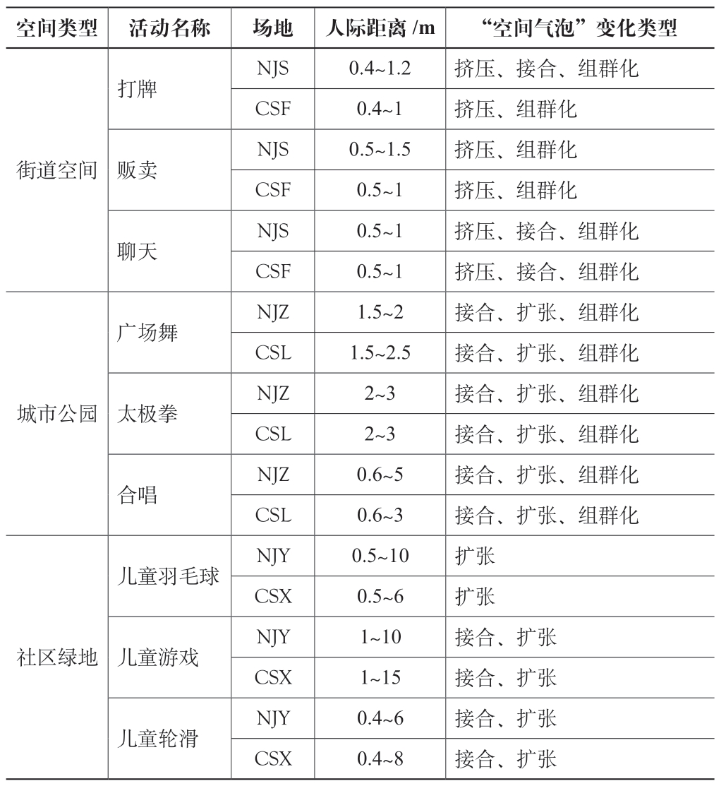 综上所述,以南京和长沙两城的街道空间、城市公园和社区绿地为案例,我们发现中国人的社交距离较霍尔的理论偏小,社交行为可在极近的距离内发生,并且个人空间距离呈现出挤压、接合、扩张和组群化等变化(表2)。