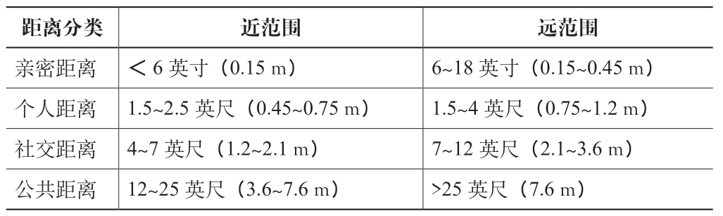 霍尔在《隐匿的尺度》中对空间距离的分类,实际上是从人的身体出发,推及对空间和城市的认识(表1)。以个人距离为例,霍尔将其定义为“一个生物用以区分自我和他者的小型保护领域或气泡”。个人距离包括两个范围:近范围为45~75 cm,在此距离范围内,一个人可以控制或抓住另一个人;远范围为75~120 cm,即两个人张开双臂,指尖相碰时身体的距离[1]119-120。