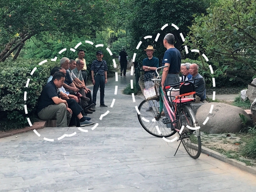 而在长沙枫树山社区,一部分前来接孩子放学的家长围坐在一起,也选择玩扑克牌来度过等待的时间。家长们围合成一个紧密的空间,个体之间的距离约为0.4~1 m。当被问到人与人之间紧挨在一起的感受时,一位女性说: