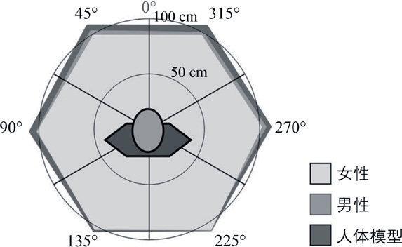 我国已有学者对中国人的个人空间圈进行了研究。早在1988 年,杨治良等发现不论性别、年龄或文化的差异,人们对正前方的空间距离需求大于后方所需的空间距离[21](图6)。相类似地,葛国宏发现“个人空间气泡”不是规则的圆形,而是呈椭圆形,其前方的安全距离大于后方的距离[22]。