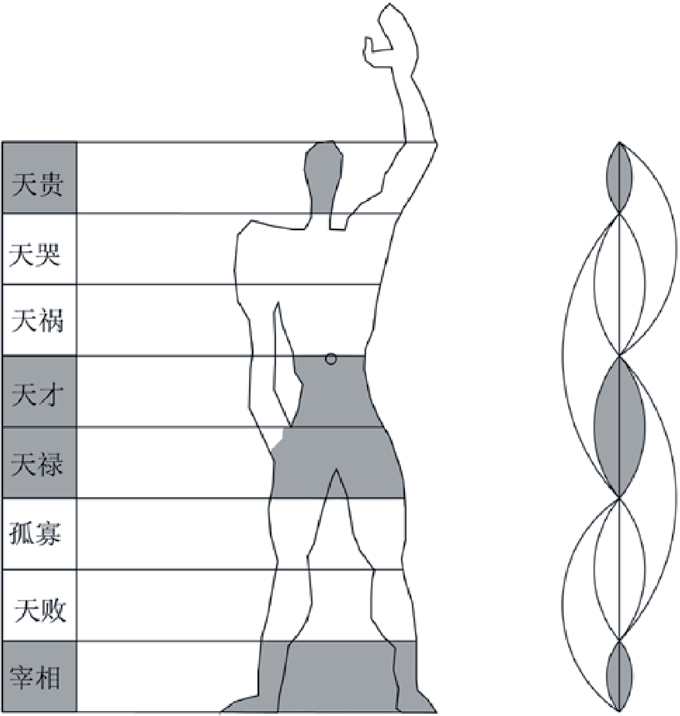中国传统文化中也存在着与身体尺度相关的独特度量系统。在侗族建筑中,工匠们在测量基地时,以水平张开的双臂作为标尺,其长度基本等同于他们的身高;张开手指时,以大拇指尖到中指尖的距离作为半尺,称为“一拃半尺”[10]。与柯布西耶的通用模度不同,侗族工匠建造时运用的工匠尺并不是采用统一的度量标准,而是根据不同制作匠师的身体尺度和比例各有不同。工匠尺的单位不是抽象的几何数字,而是参照人体的头、腰和关节等重要部位,赋予了吉祥和不吉祥的象征意义(图3)。在运用工匠尺确定建筑物的高度和平面尺寸时,必须在表示吉祥的单位中选择[11]。