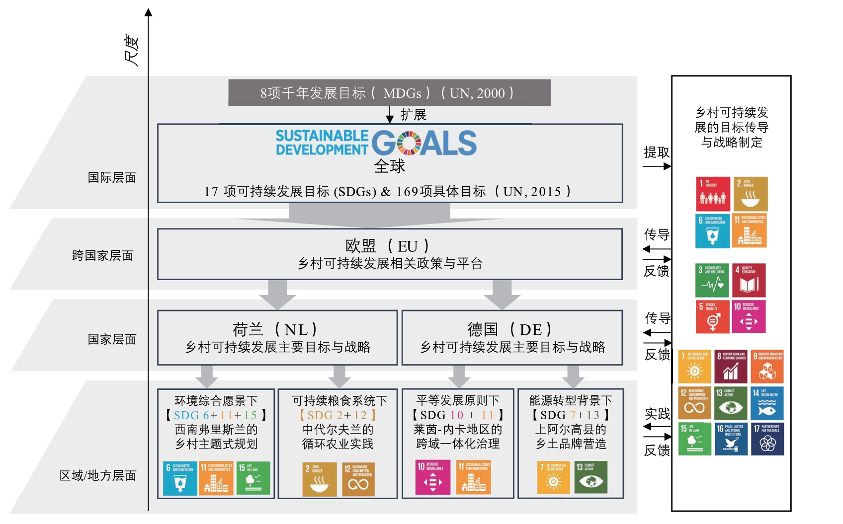 SDGs 从全球传导到地方需历经多个尺度,其理解和实践会因不同的区域环境和治理层级产生差异[8],乡村发展战略的制定和调整也离不开各国的发展情境与价值选择。为此,本文将SDGs 看作乡村发展的纲领性战略框架,沿着“全球—跨国家—国家—区域/地方”的层级逻辑(图3),分节阐述这一全球目标体系如何影响欧盟及其成员国的乡村战略制定。通过提炼荷兰、德国的乡村实践案例在反馈全球SDGs和国家战略时所进行的在地创新,总结两国的相关经验及不足,以期提出相应的政策建议。